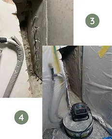Nachdem die Fehlerstelle freigelegt war, erfolgte eine gründliche Reinigung, gefolgt von der Bohrung von Löchern im 45% Winkel für die nachfolgende Rissverpressung (3). Packer wurden gesetzt um die Verpressung der Risse zu ermöglichen. Zusätzlich wurde eine druckwasserfeste Abdichtung mit unserem bewährten EcoDicht FPD Abdichtungsmaterial durchgeführt (4).