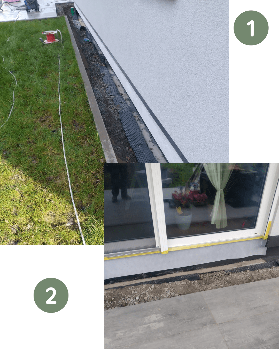 Zunächst entfernte der Kunde die vorhandene Dämmung und legte das Erdreich frei. Die Außenwände wurden von uns für die neue Abdichtung vorbereitet, und die Oberkante der geplanten Abdichtungshöhe wurde gemessen und markiert. (1) Anschließend wurde ein Dichtband an den bodentiefen Fenstern und der Eingangstüre eingearbeitet. (2) Die Abdichtung wurde in drei Schritten aufgetragen, nachdem die alte Bitumenabdichtung gereinigt und angeschliffen wurde. Dank der haftenden Eigenschaften unseres Getifix EcoDicht auf bituminösen Materialien musste diese nicht vollständig abgefräst werden, sondern nur tragfähig und fest mit dem Untergrund verbunden sein.
