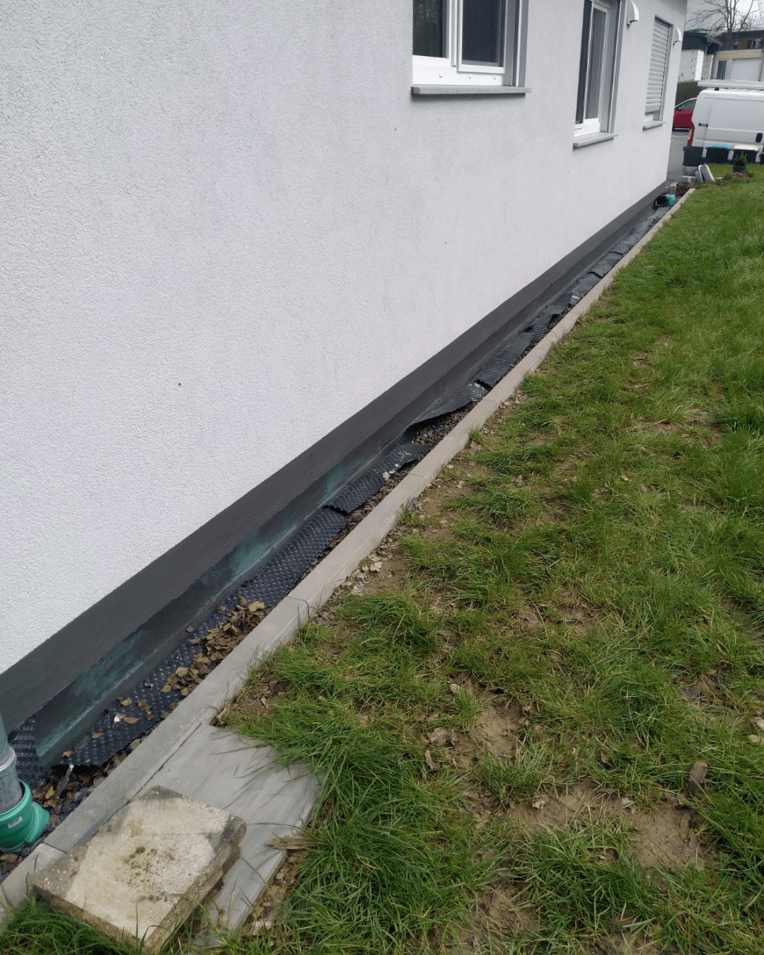 Nach Abschluss der Arbeiten ist das Ergebnis deutlich sichtbar: Die Abdichtung ist vollständig durchgetrocknet, und der Schimmel wurde entfernt. Die Dämmung sowie die Noppenbahn werden wieder in Eigenleistung von unserem Kunden installiert.