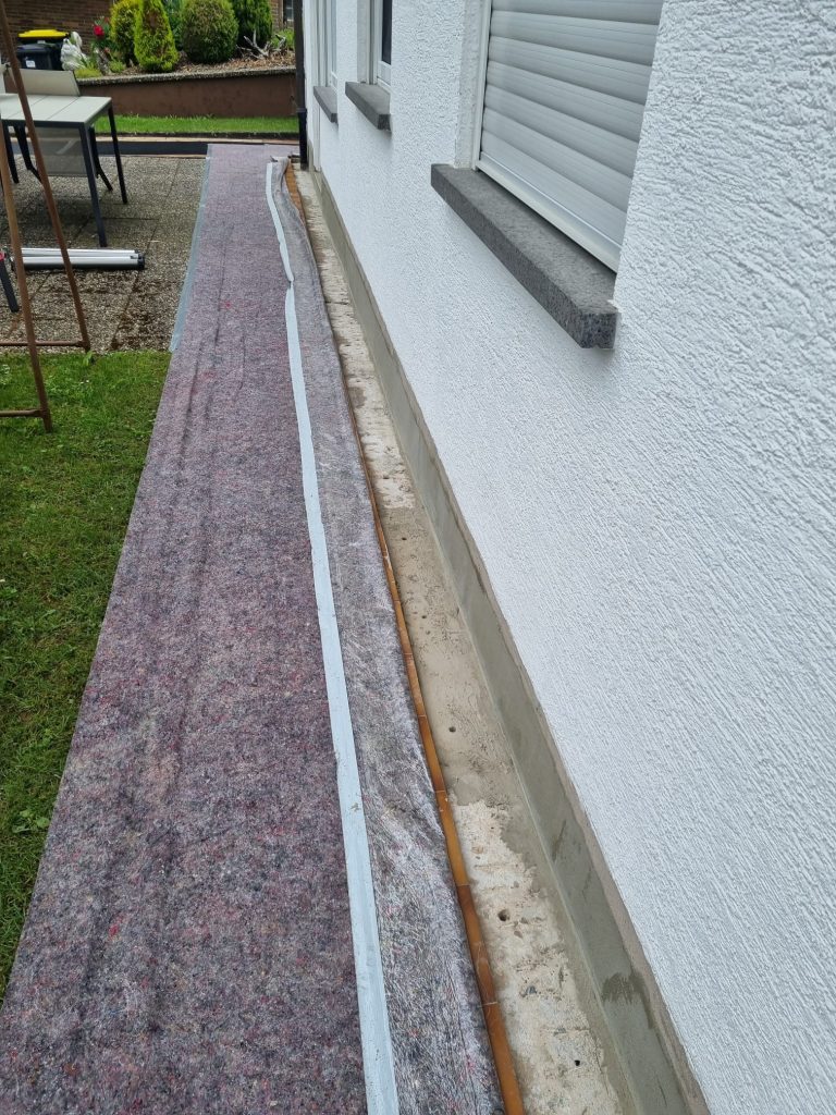 Die Sockelabdichtung ist 20 cm in den erdberührten Bereich und 30 cm über Geländeoberkante aufzubringen.